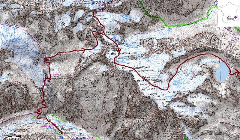 C'est où ? ça passe par où ?-> La trace de la course (montée au refuge du Glacier Blanc, les Agneaux et la traversée des Dômes) sur la carte. <-