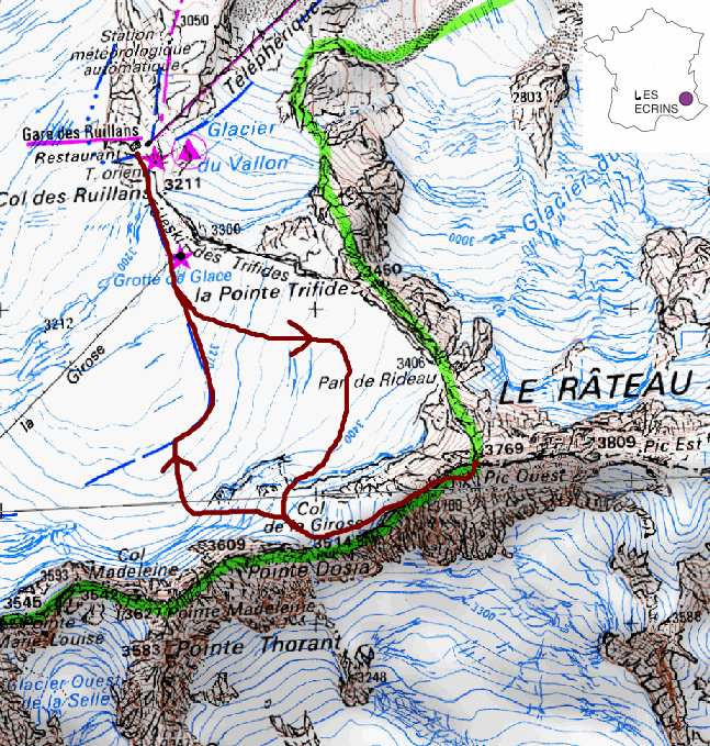 Le Pic Ouest du Rateau (3769 m) présente l'avantage d'être rapidement accessible depuis le téléphérique de La Grave. Il se fait aisément dans la journée. C'est parfait pour une initiation à l'alpinisme. Le village de La Grave se trouve versant nord du col du Lautaret non loin de Serre Chevalier.