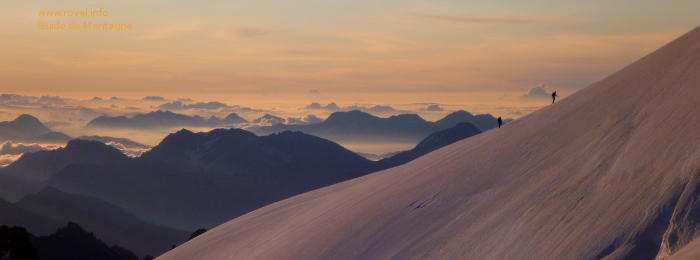 Jour 2: Le lendemain, il faut compter encore 4/5 heures d'ascension en crampon dans la face glaciaire vers le Dôme des Écrins (à droite sur l'image). Le Belvédère là-haut sera à la hauteur de vos espérances et de votre effort !