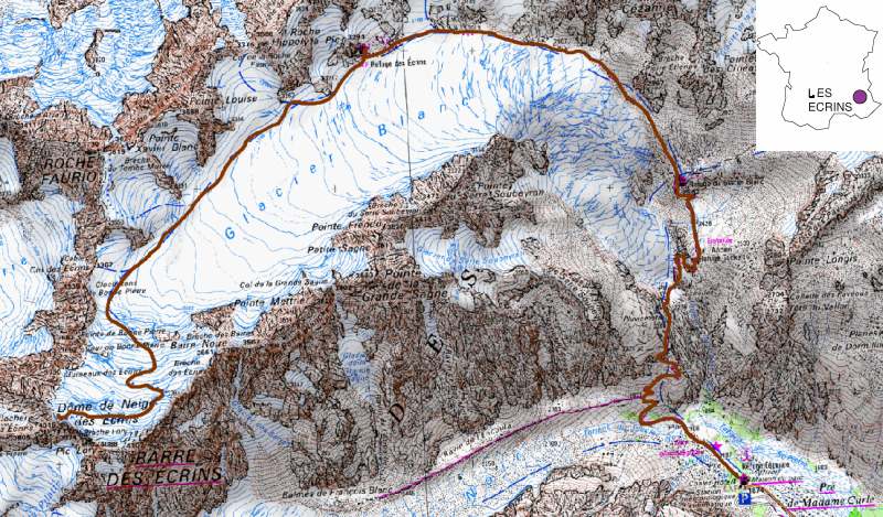 C'est où ? ça passe par où ? -> La trace de la course (montée au refuge des Ecrins et le Dôme) sur la carte. <-