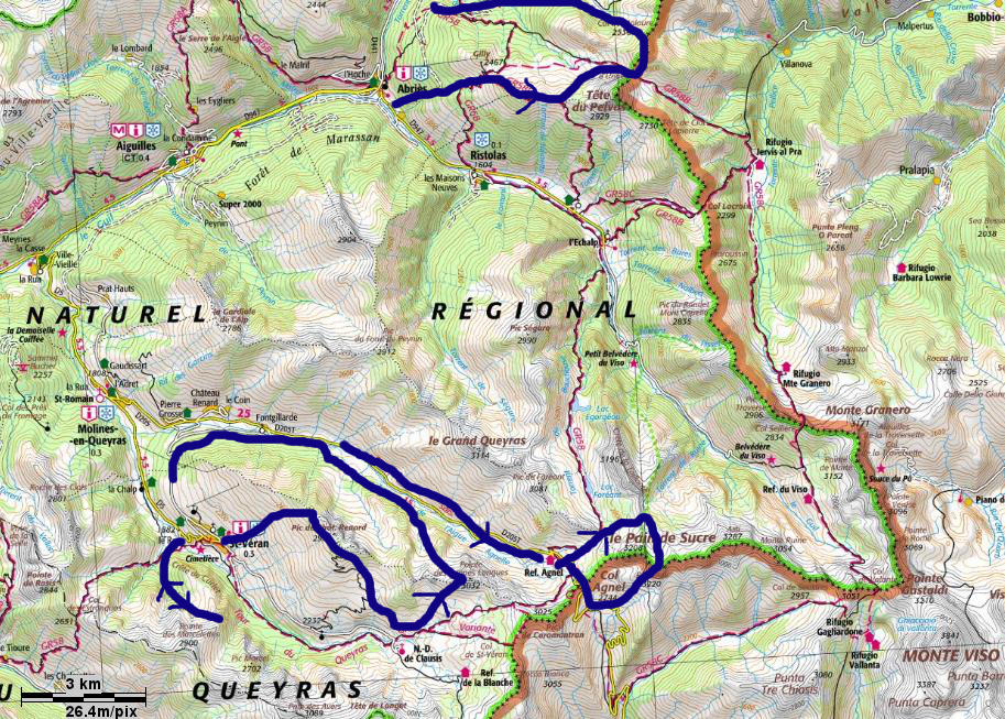 J2: Montée en haut de la station de Molines - St Véran à 2900 m et Montée au Pic de Chateau Renard. Descente en Sud vers la chapelle de Clausis puis montée vers les Sagnes Longues (pointe ou col) et grande descente en Nord ou en Sud suivant les conditions !